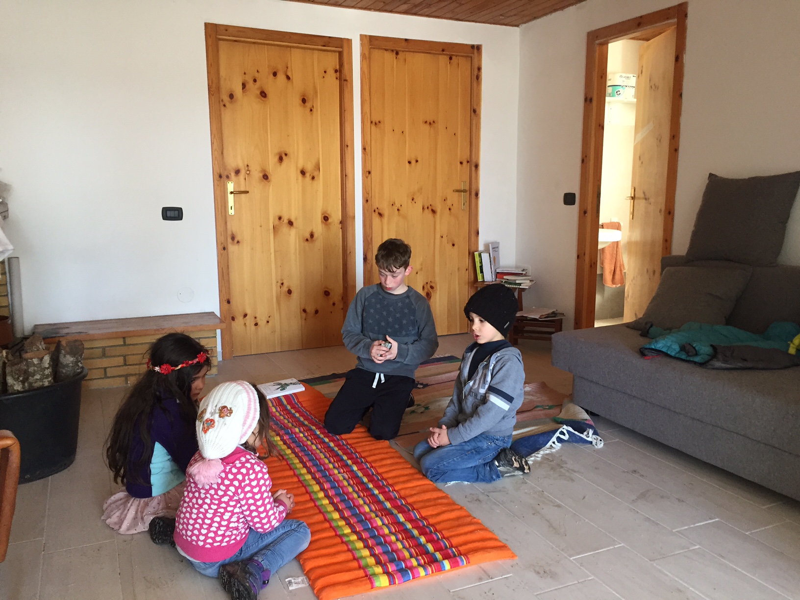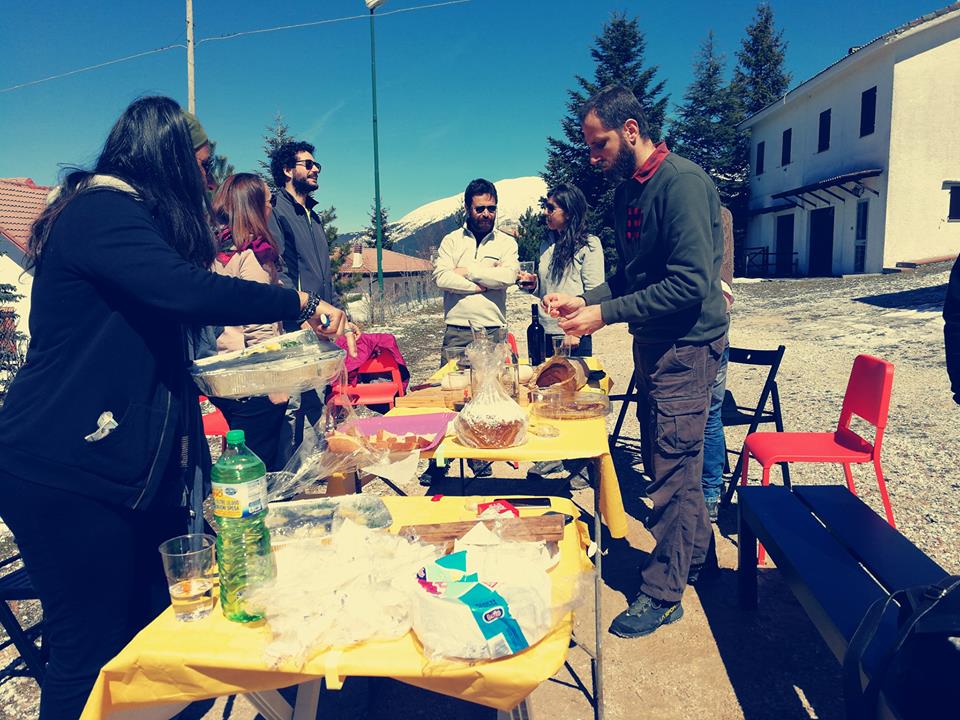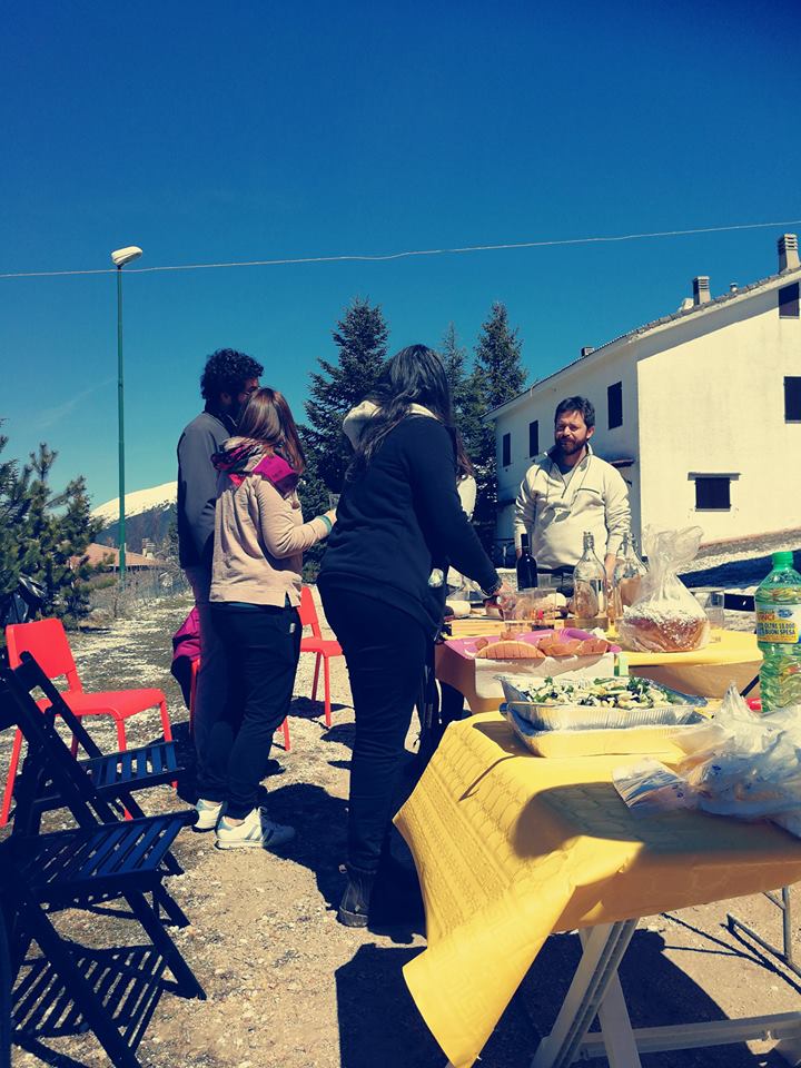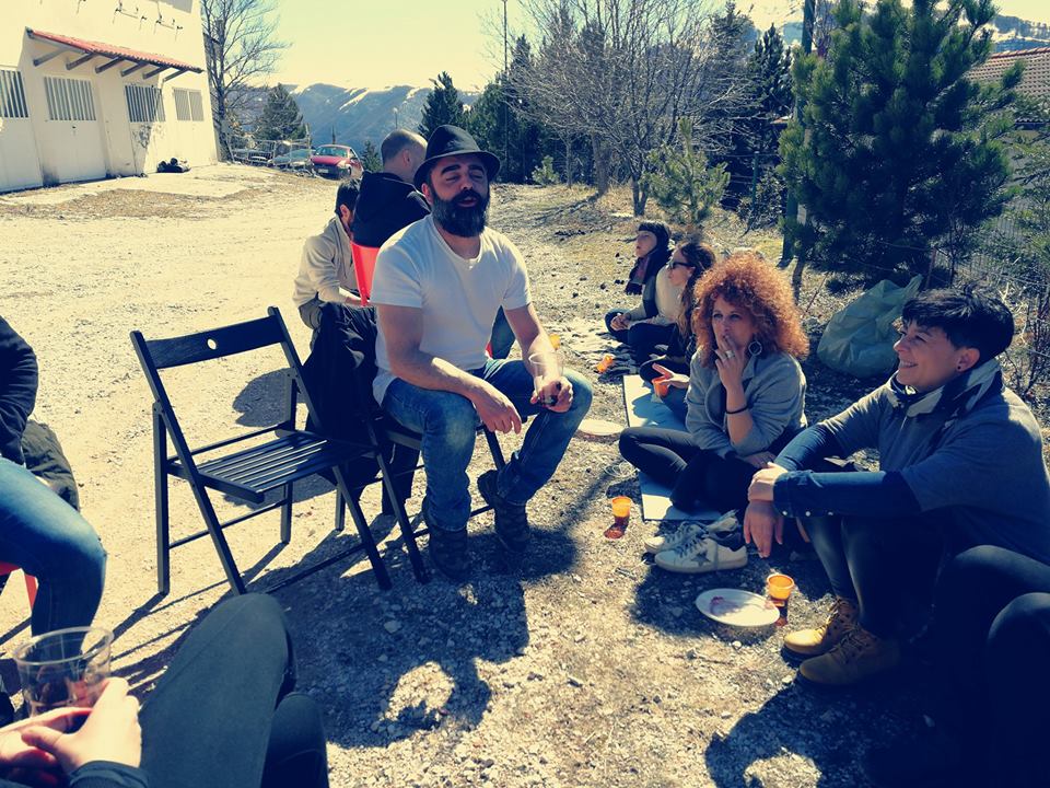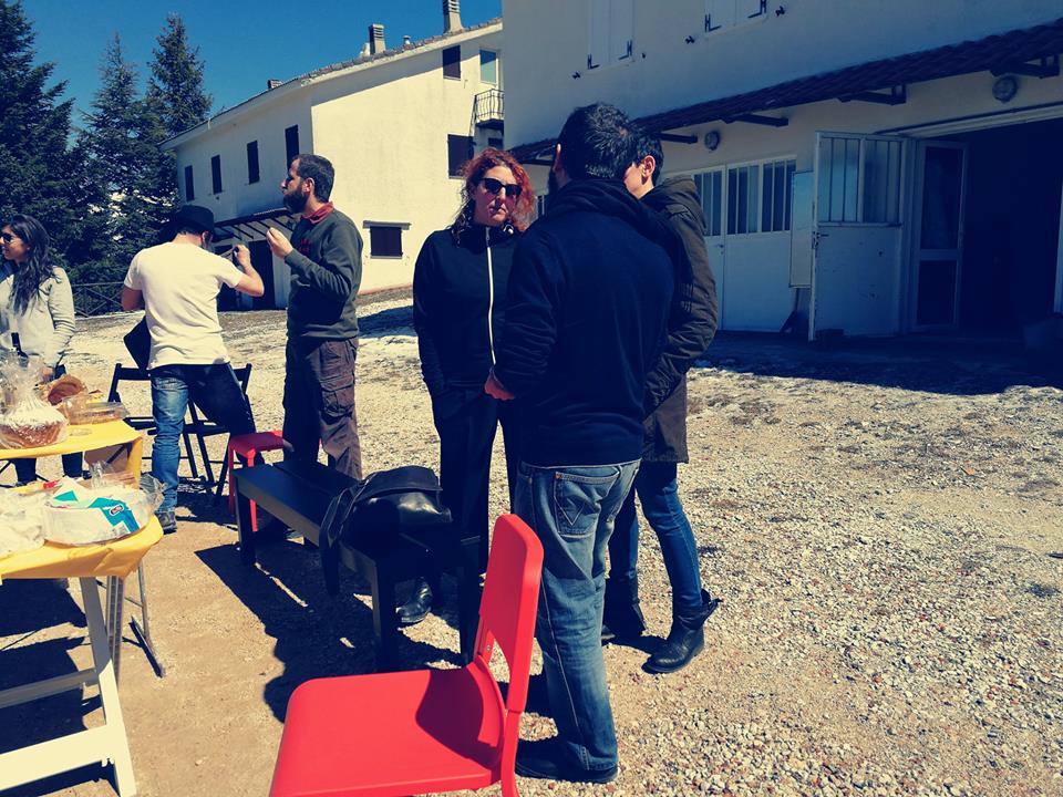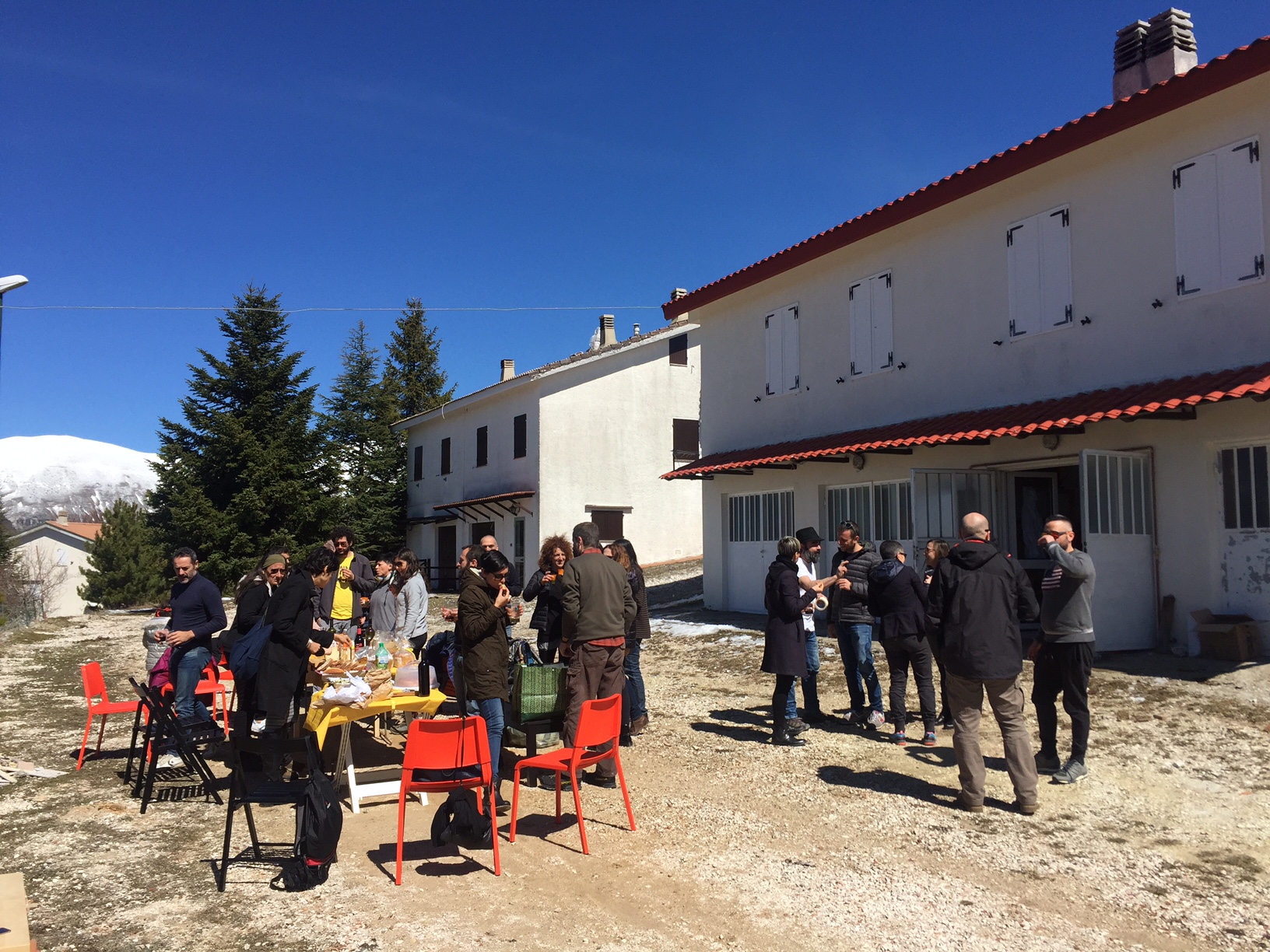 Luca di #ripartidaisibillini scrive: “Io e Consuelo siamo in un casalinghi, mandateci la lista delle cose che vi mancano e ci pensiamo noi”. Alessandro, regista di Sassi, telefona direttamente: “Noi saremo in sei con due bambini, che dici se facciamo scorta all’alimentari e arriviamo tutti?”. Paola e Andrea, famiglia Brachetti: “Stiamo arrivando, portiamo l’intera famiglia e tutto quello che non serve. Ah! Anche un po’ di amiche che corrono coi lupi, ma non dirlo a Patrizia che è una sorpresa!”. E con loro arrivano l’energia e i sorrisi di Marisa, Manuela, Marika e Simona. Marco e Lucia (Tenuta Scolastici): “Noi a Pasquetta siamo da voi. Saremo poco originali ma… portiamo i nostri formaggi!”. E poi Silvia e Chicca di Hacca Edizioni / Kindustria con il primo quadro da appendere: un capriolo che racconta storie di «amori che hanno a che fare con i percorsi, quelli che hanno a che fare con la solitudine e poi ci sono quelli che non servono a niente, gli amori altissimi.». E due amici da Bologna, curiosi e appassionati. Arriva anche Daniele della Compagnia dei Cammini con la sua famiglia: la presenza che rincuora e la bellezza che fa tornare. Simone di Active Tourism e i suoi amici salgono a piedi, con zaini, racchette e cane assetato al guinzaglio, già pronti per Diverso il suo Rilievo 2018 di Alpinismo Molotov. Da Ussita arrivano anche Michela e Stefano con la prima ricotta prodotta dalle loro pecore sopravissane dopo il terremoto, i piccoli Diego ed Emma si uniscono subito agli altri bimbi per scorrazzare sull’erba. E poi Roberto, Christian e Alberto di Movimento Tellurico, uomini preziosi pronti a fare gli onori di C.A.S.A.