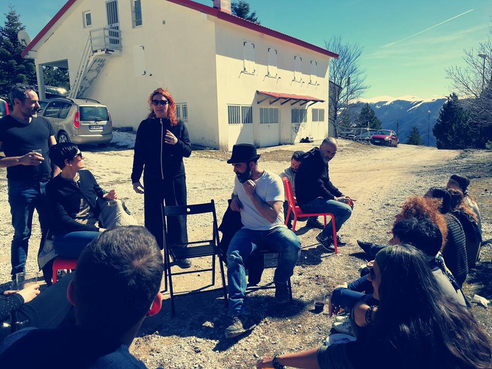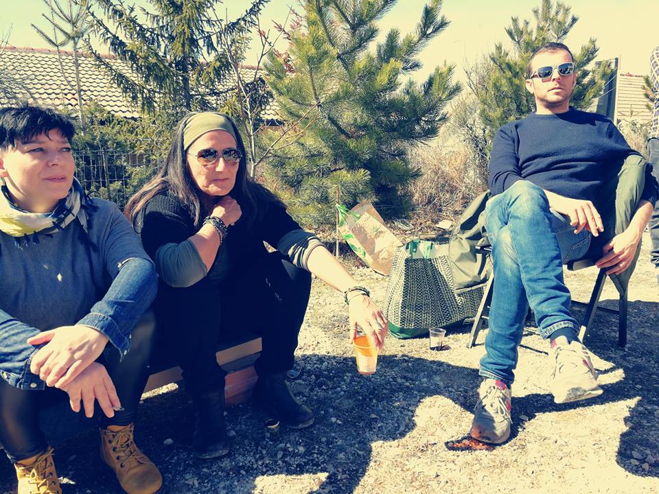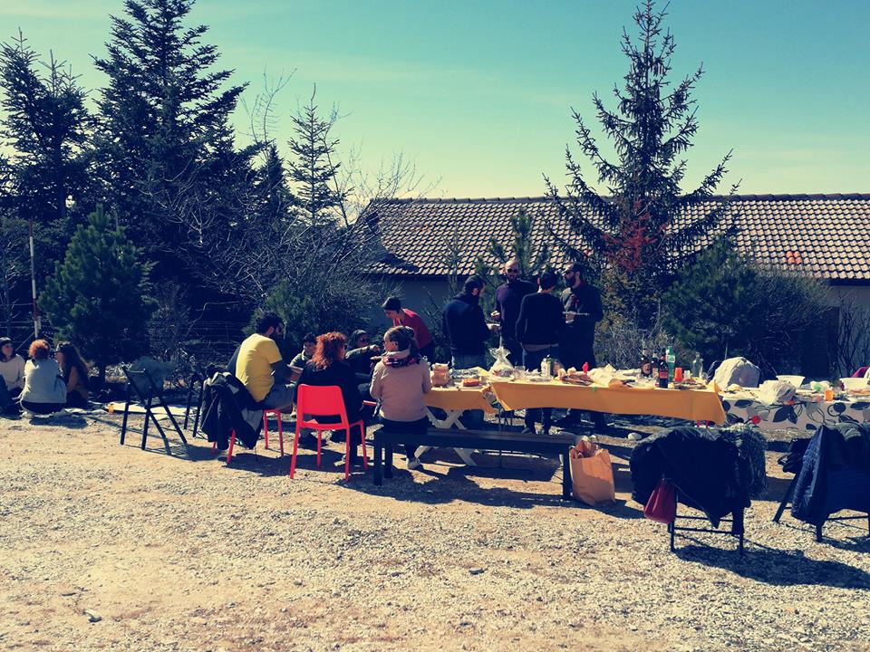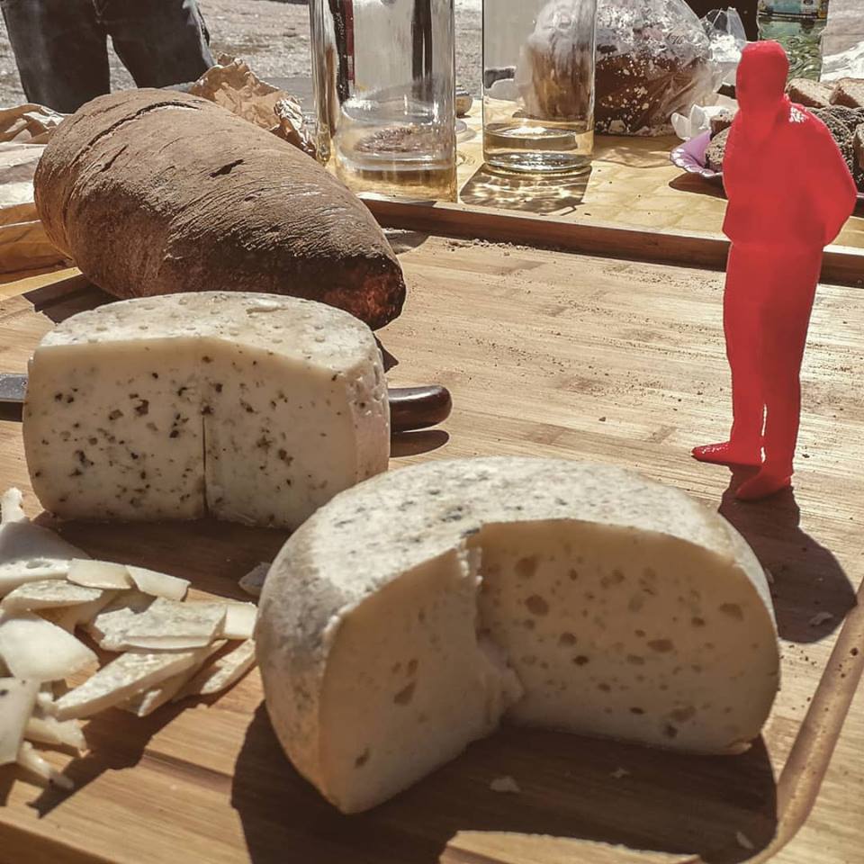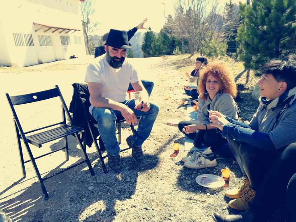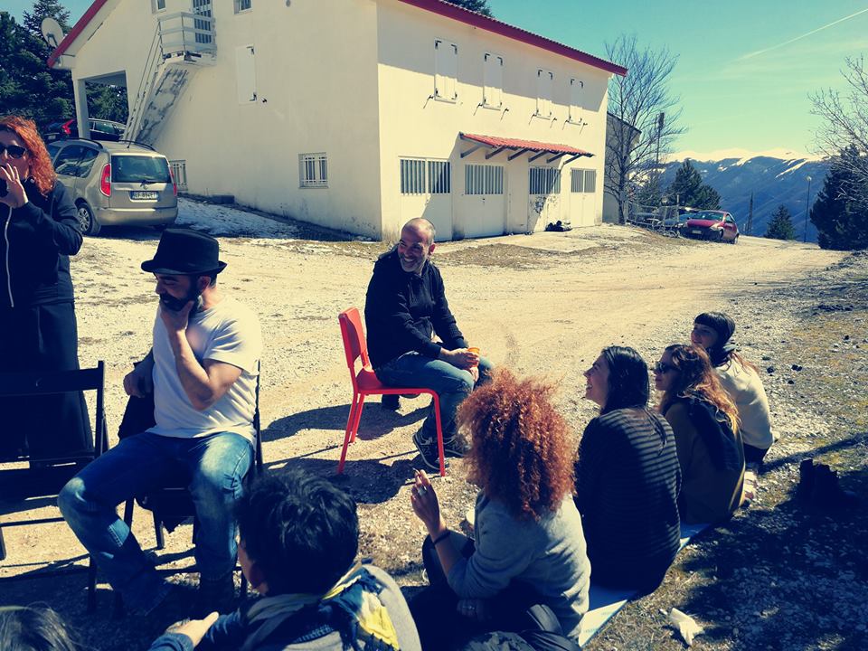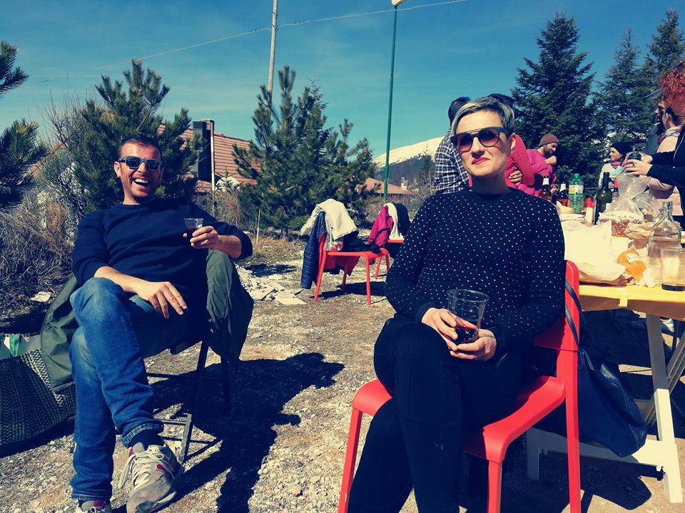 Non ci conosciamo tutti, così ci raccontiamo a piccoli gruppi su panche, sedie, tappeti, tronchi, sassi e mattoni sparsi qua e là. Un umarell realizzato in stampa 3D vigila i formaggi, un paio di ciauscoli e un tappeto di torte salate di tutti i colori. L’amore per questa terra e il desiderio di immaginarne insieme il futuro ci uniscono con un filo invisibile.